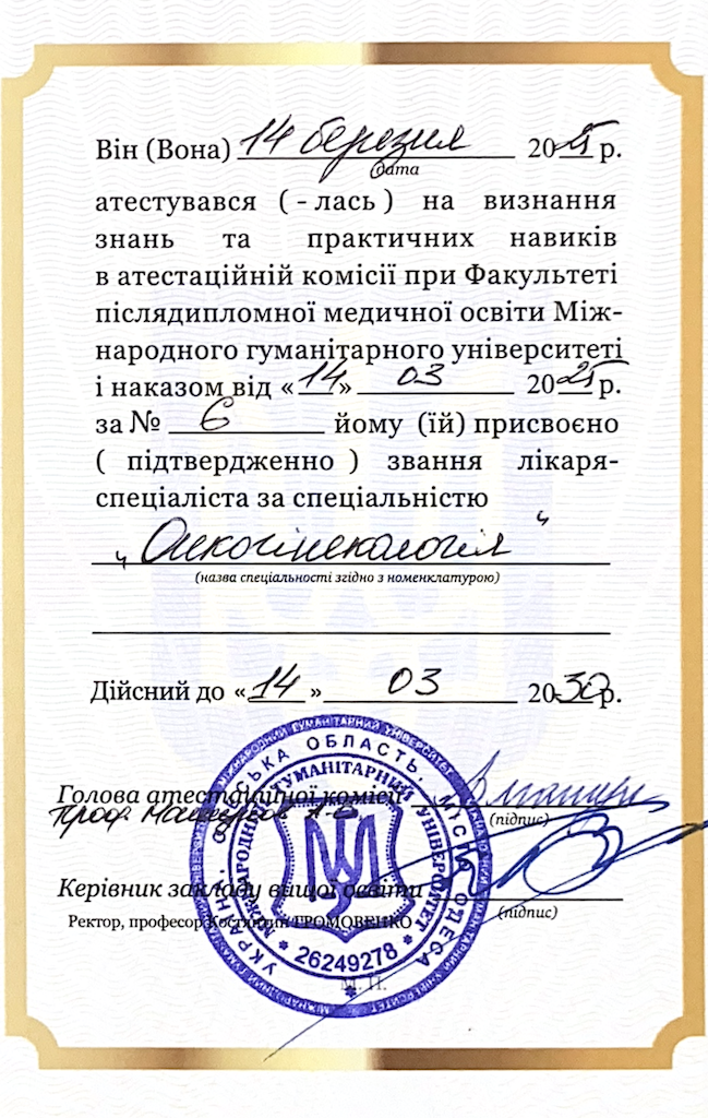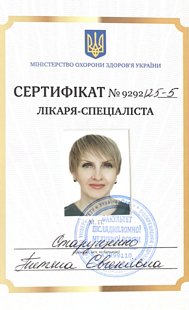 2021 рік — атестувалась на визнання знань та практичних навичок в атестаційній комісії при Факультеті післядипломної медичної освіти Міжнародного гуманітарного університету, і наказом від 23 листопада 2021 року за №75 присвоєно (підтверджено) звання лікаря-спеціаліста за спеціальністю «Організація і управління охороною здоров’я»